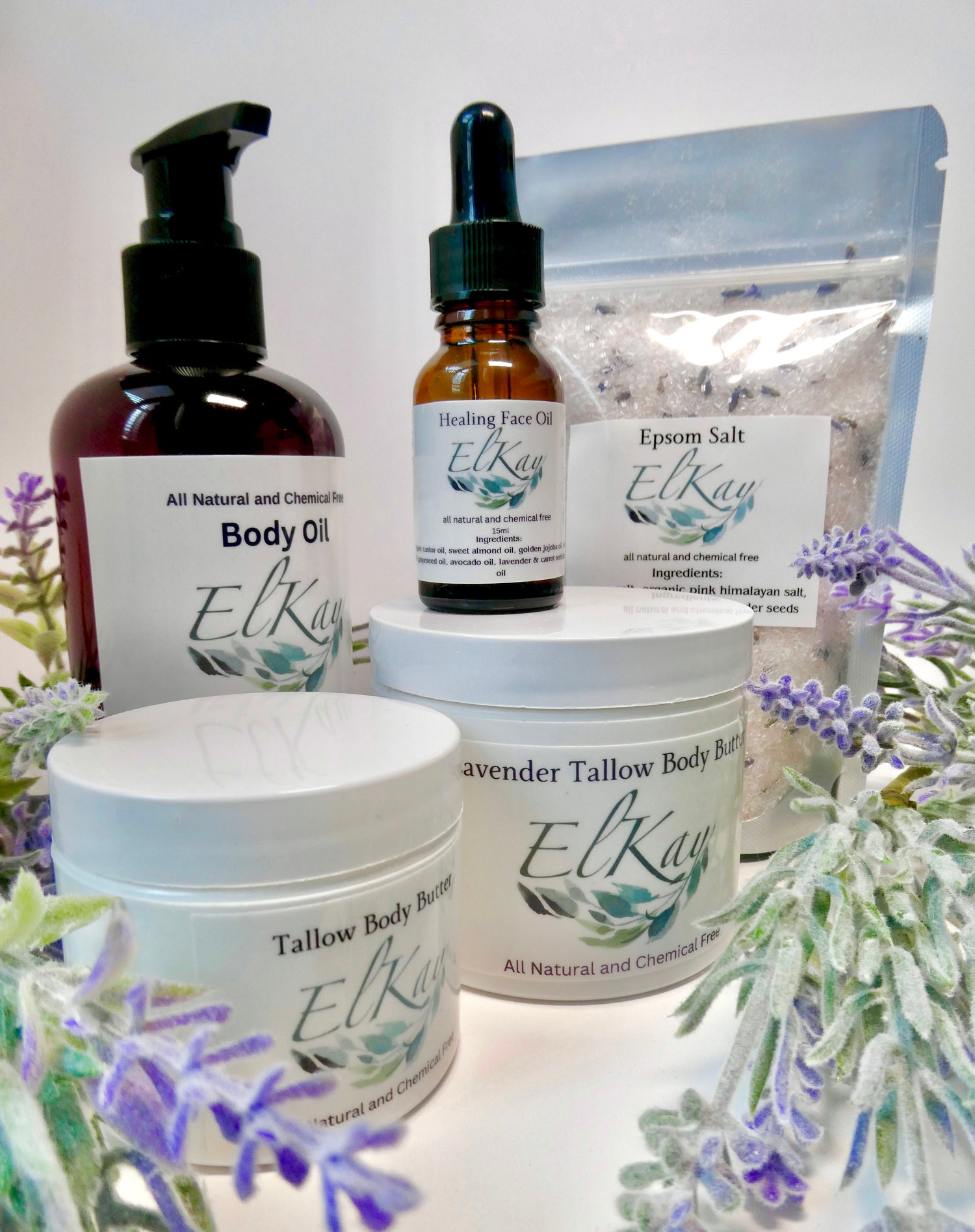 All products are made with natural ingredients that give the skin what it needs. The butters (like shea and Organic Beef Tallow) are rich in fatty acids and vitamins that nourish, soften, and protect the skin’s barrier. The oils (like coconut, jojoba, or almond) are lightweight and full of nutrients that lock in moisture, smooth the skin, and support healing for lasting results.